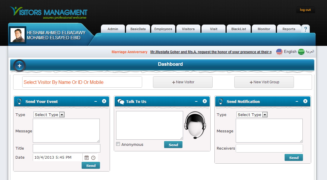 Appointment approval and rejections, Pre-registration of groups and individuals for one or multiple days , Email/SMS notifications on requests, approvals and rejections, Today's appointments and expected visitor, Visitor sign-out, Blacklisting of Visitors, Central visitor application to track current and pending visitors, Visitor and group registration, Work flow and permissions to manage visitor application, Overdue visit auto e-mail notification or Windows Notifications.